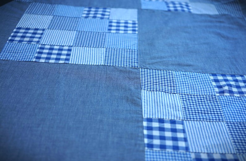 インドに在庫があるチェックやシャンブレー生地をランダムなサイズで組み合わせたパッチワーク生地です。